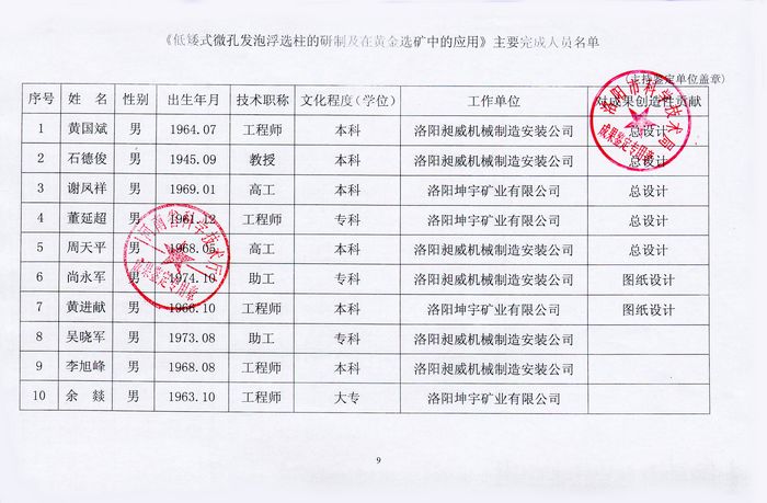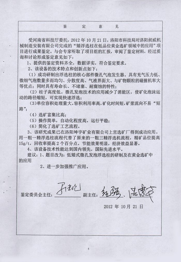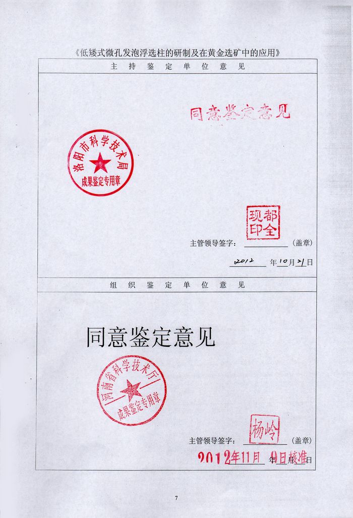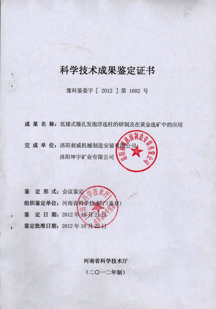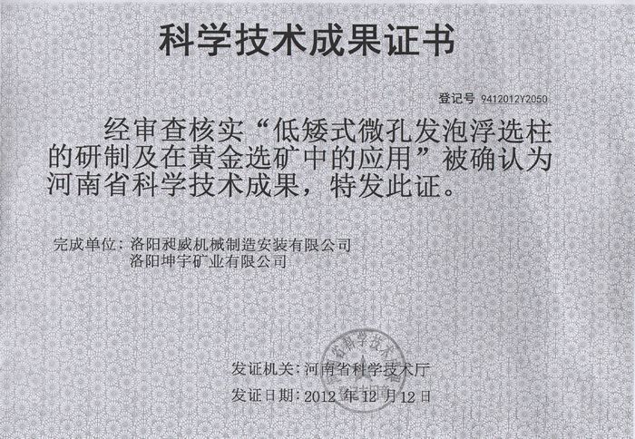 熱烈慶祝洛陽(yáng)昶威低矮式微孔發(fā)泡浮選柱通過(guò)河南省科學(xué)技術(shù)廳科技成果鑒定。后附“科技成果鑒定證書”